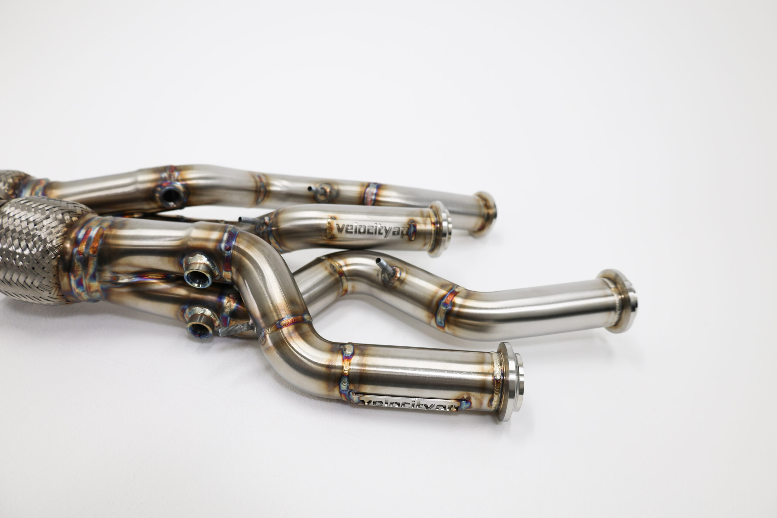 The Lamborghini Aventador LP700 is an absolute beast. The high revving normally aspirated V12 is one of the most fantastic sounding engines out there, but it still needs to sing!!! Velocity Automotive Performance has created these Cat Delete Pipes to allow your Aventador to wail like a banshee, increase HP and give wonderful pops & crackles on the over-run.